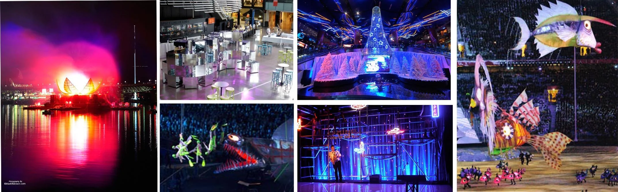 The brief was to create a giant, floating, mechanical Waratah, using pulleys and winches to open it’s petals for a spectacular reveal. It was to float in the middle of Darling Harbour on a flat-top barge with 2 shipping containers (housing the generators and mechanics) as its base. The reveal involved 32 LED covered stamen, which could change colour, smoke effects, fireworks and projected images on a fan-shaped water-screen, which rose from its centre.